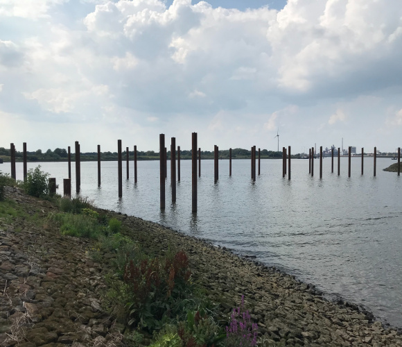 Der Firma Tiefbau GmbH Unterweser wurde 2022 der Auftrag erteilt, diese 39 Haltepfähle maßgenau unter Zuhilfenahme einer Rammführung im Rüttelverfahren im Bereich zwischen dem Lankenauer Höft und der Weserinsel einzubauen.